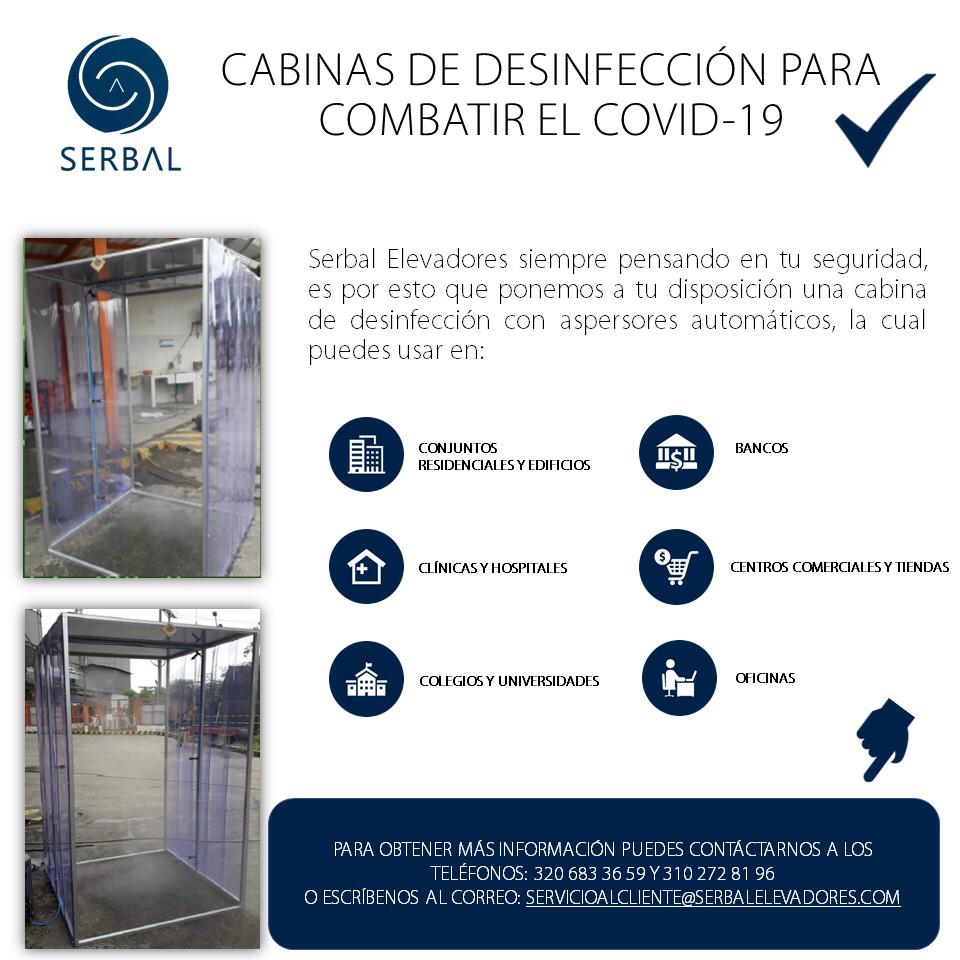 SERBAL ELEVADORES siempre pensando en la seguridad y bienestar de sus clientes, ha innovado en medio de la crisis que estamos viviendo actualmente en el país por el COVID-19, y en conjunto con el talento humano de sus colaboradores (técnicos, ingenieros, administrativos y demás), quieren aportar su grano de arena a la sociedad ofreciendo una solución que mitiga la propagación del COVID-19, se trata de la implementación de una cabina de desinfección con aspersores automáticos para desinfectar personas, objetos y mascotas.
